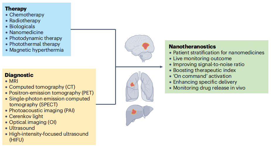 Nanotherapeutic drugs are systems that combine therapeutic agents and imaging agents in nanocarriers, which can recognize diseased tissues by targeting molecular or material properties, and can also be activated by endogenous or exogenous stimuli. Advantages of nanotherapeutics include the ability to stratify patients, order activation, and enhance therapeutic efficacy.